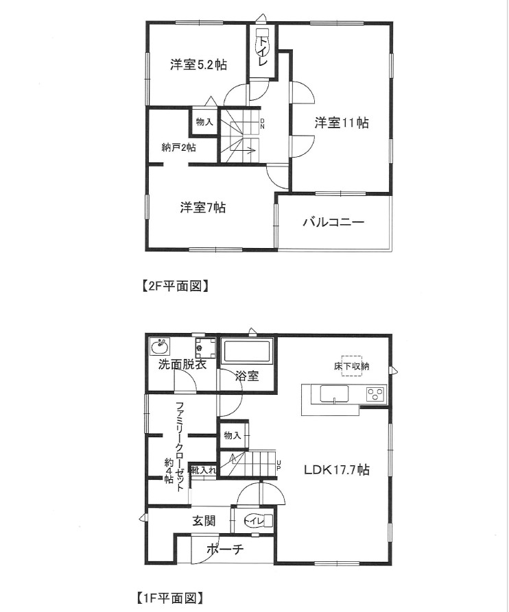 階数・所階階 | 2階建 | 間取り | 3SLDK+ファミリークローゼット | 間取り内訳 | LDK17.7・洋11・洋5.2・洋5.2 | |||||||||